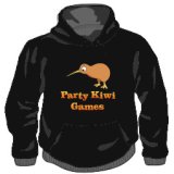 Een mooi zwart T-shirt van prima kwaliteit, met de opdruk "Party Kiwi Games" en het welbekende Kiwi-logo.